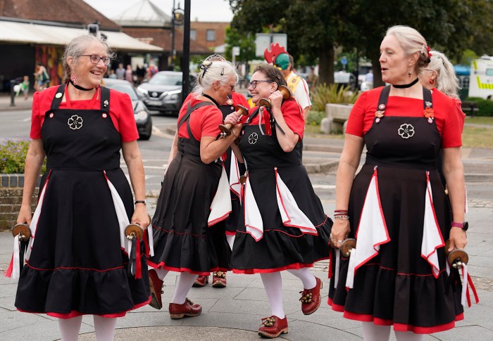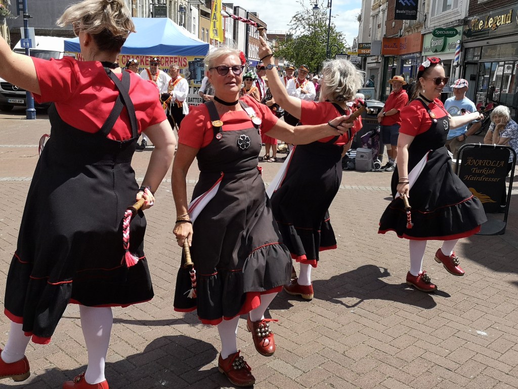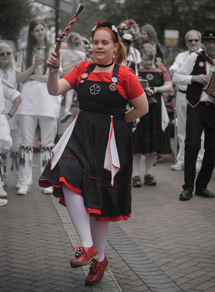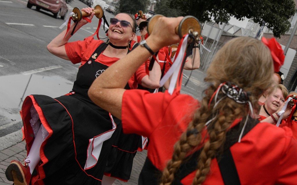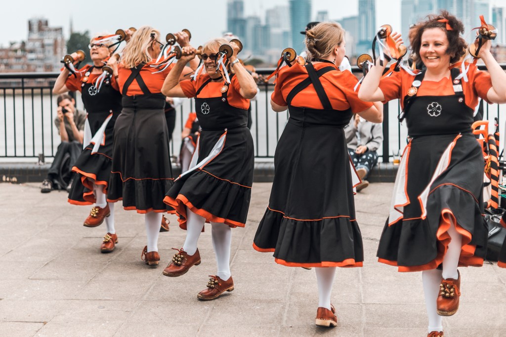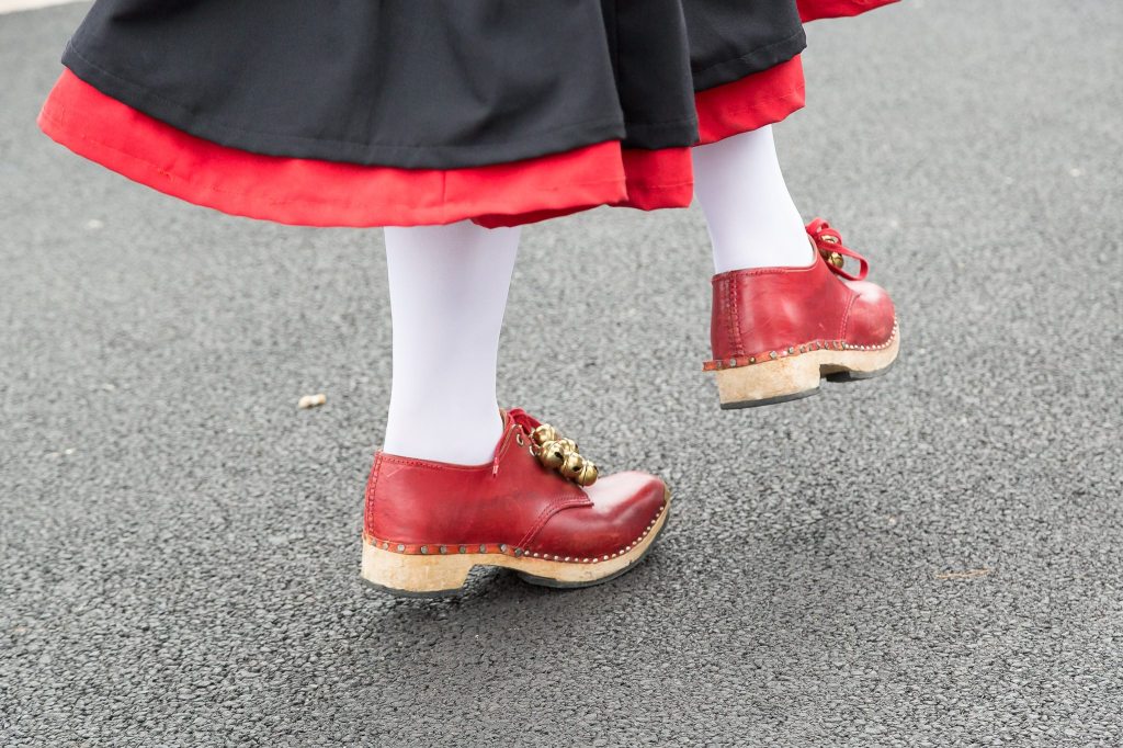 The Mayflower dance style originates in the mill towns of Lancashire. The traditional North West women’s costume is a pinafore dress with white petticoats and clogs. We don’t use the long sticks most people expect to see morris dancers wielding, or hankies, instead we dance with garlands, slings, bobbins and short sticks with bells and ribbons attached.